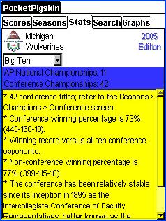 The Conference selection displays significant details in conference play, such as the number of championships, cumulative records, and other notable accomplishments. |