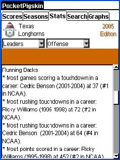 The Leaders selection notes player stats that rank at the top of the NCAA historical records. Categories include Offense, Defense, and Special Teams. |
